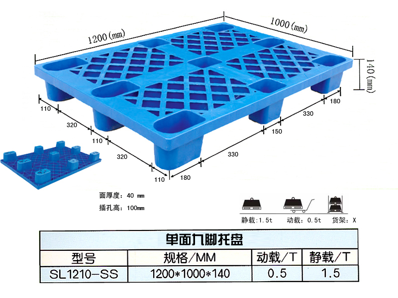 注:九腳網(wǎng)格托盤內(nèi)部可加入鋼管,是為了達(dá)到增加承載的目的,延長(zhǎng)托盤的使用壽命,塑料托盤如要在低溫環(huán)境中長(zhǎng)期使用,要選擇全新料生產(chǎn)的產(chǎn)品。